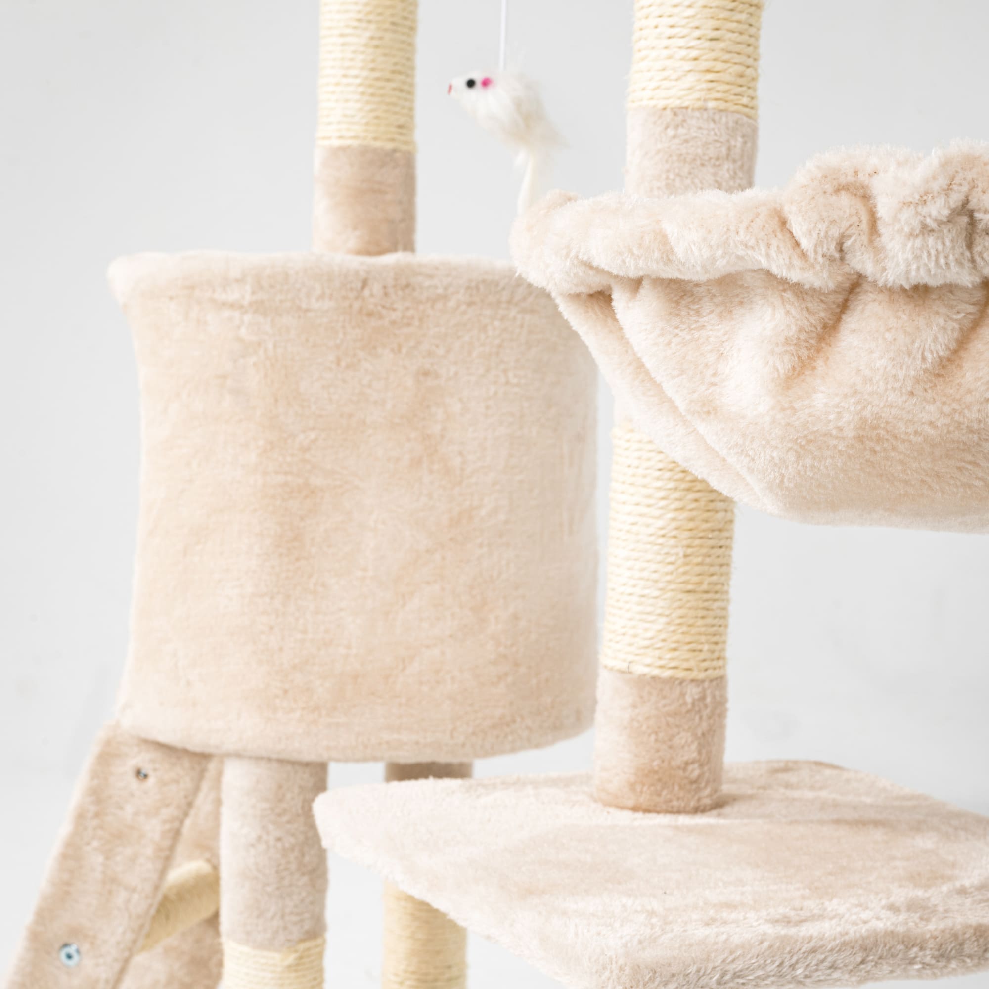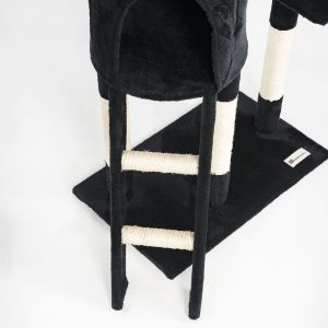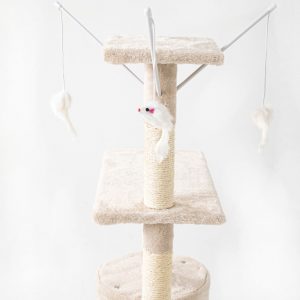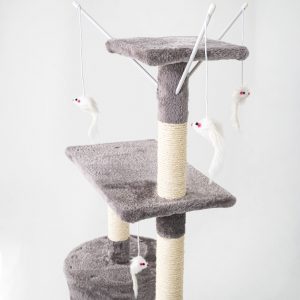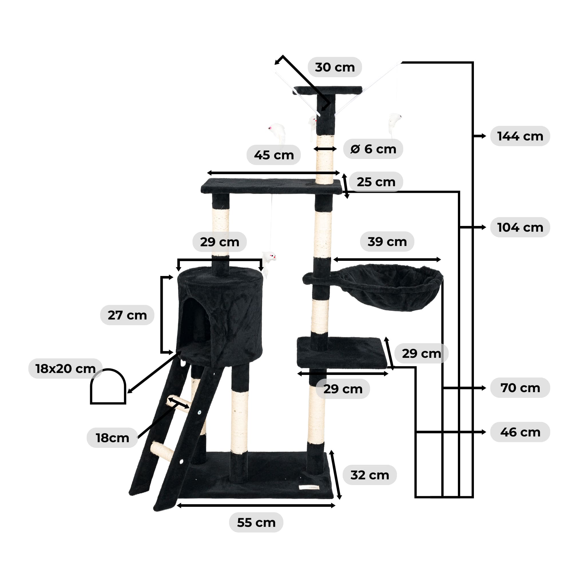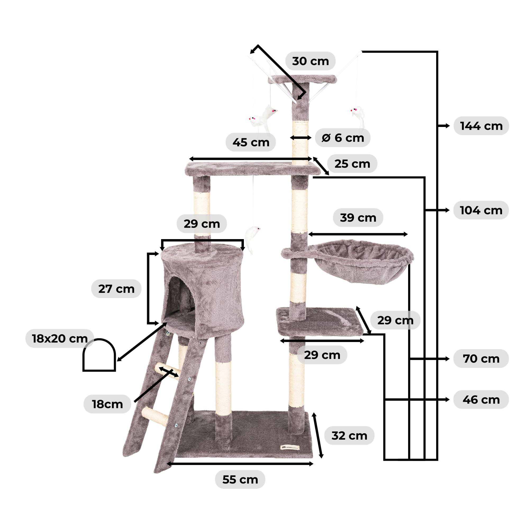 Incluye tres plataformas de distintos tamaños, una acogedora caseta de 29 cm de diámetro y 27 cm de altura, y un cómodo nido de 32 cm de diámetro, proporcionando diversas opciones de descanso y juego. Además, cuenta con una escalera de 18 cm de ancho y tres barras con ratones colgantes de 30 cm, perfectas para estimular el instinto cazador de tu gato.