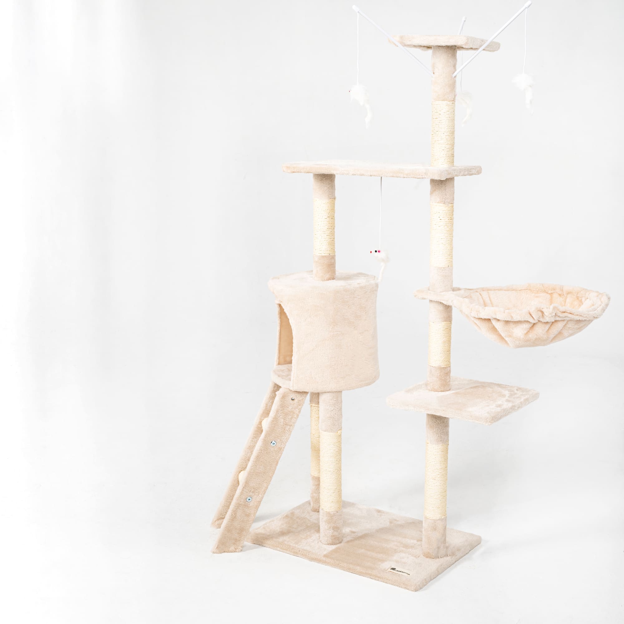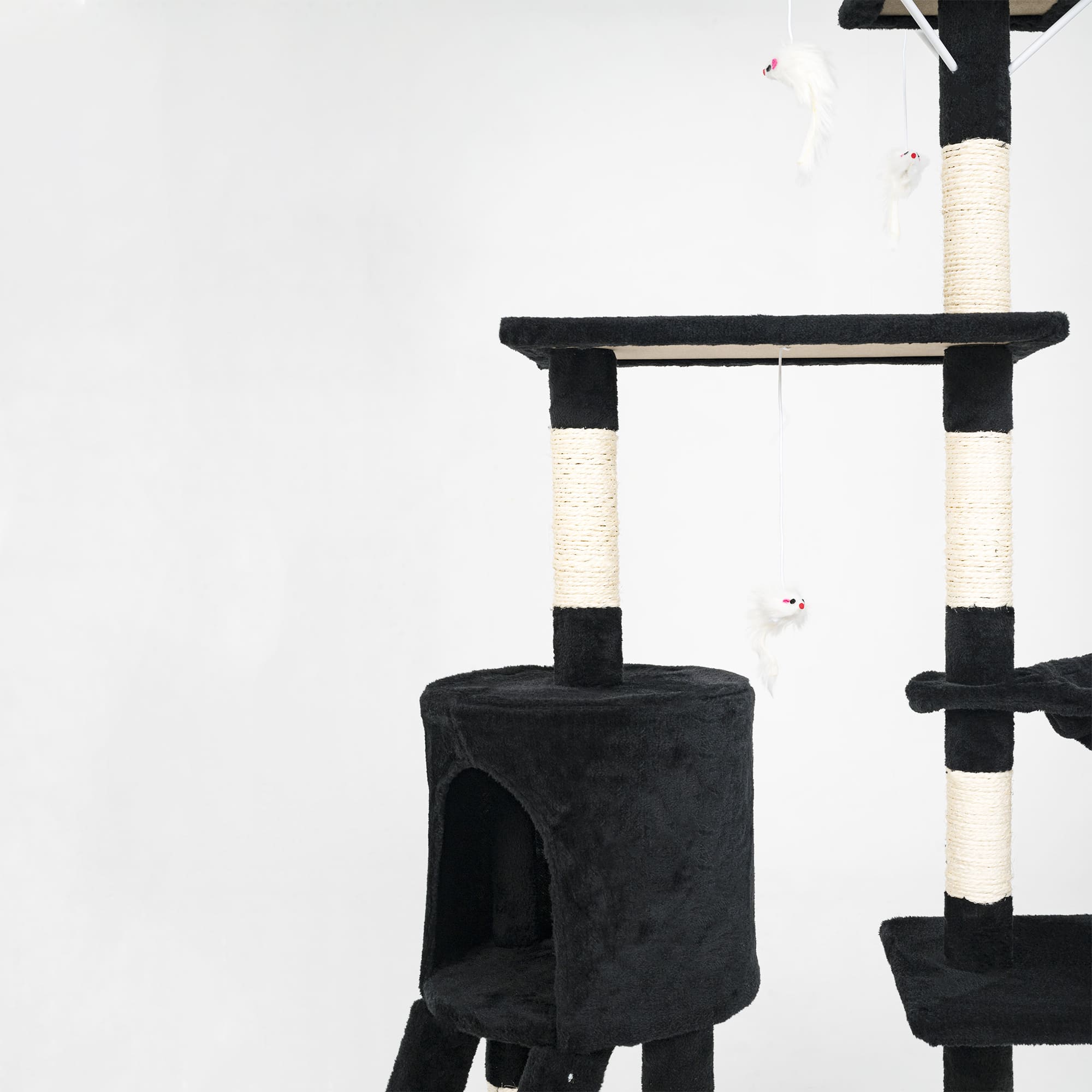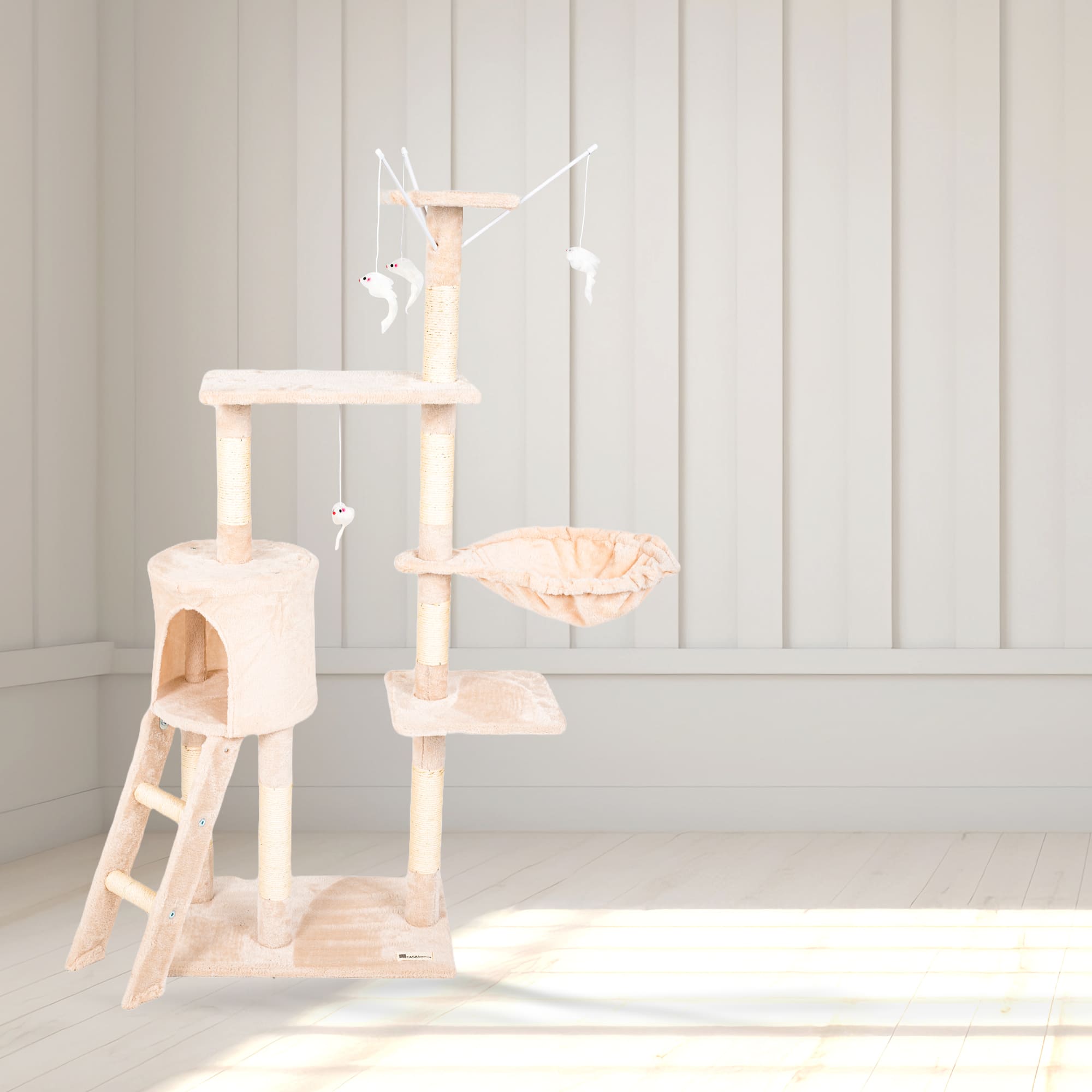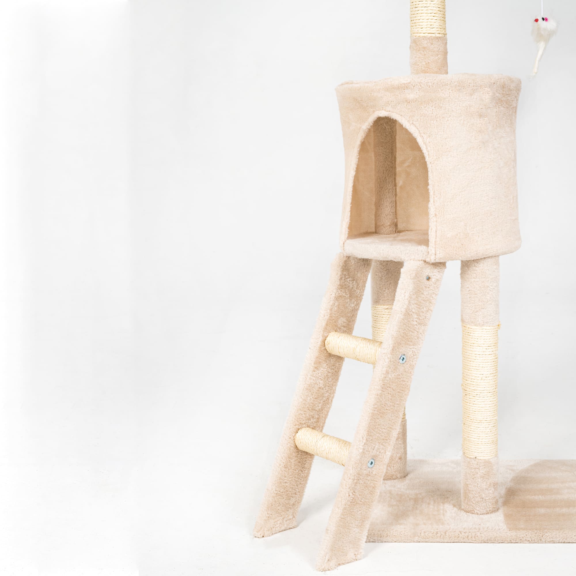 Incluye tres plataformas de distintos tamaños, una acogedora caseta de 29 cm de diámetro y 27 cm de altura, y un cómodo nido de 32 cm de diámetro, proporcionando diversas opciones de descanso y juego. Además, cuenta con una escalera de 18 cm de ancho y tres barras con ratones colgantes de 30 cm, perfectas para estimular el instinto cazador de tu gato.