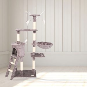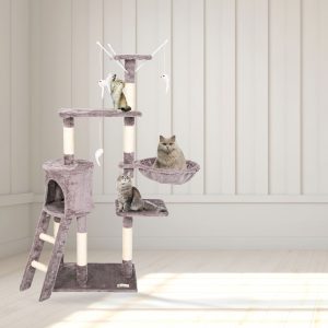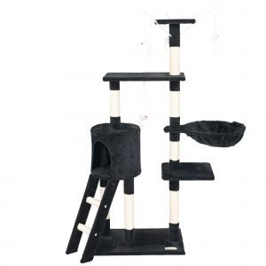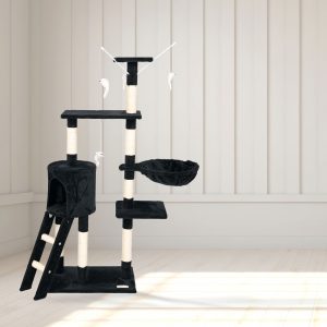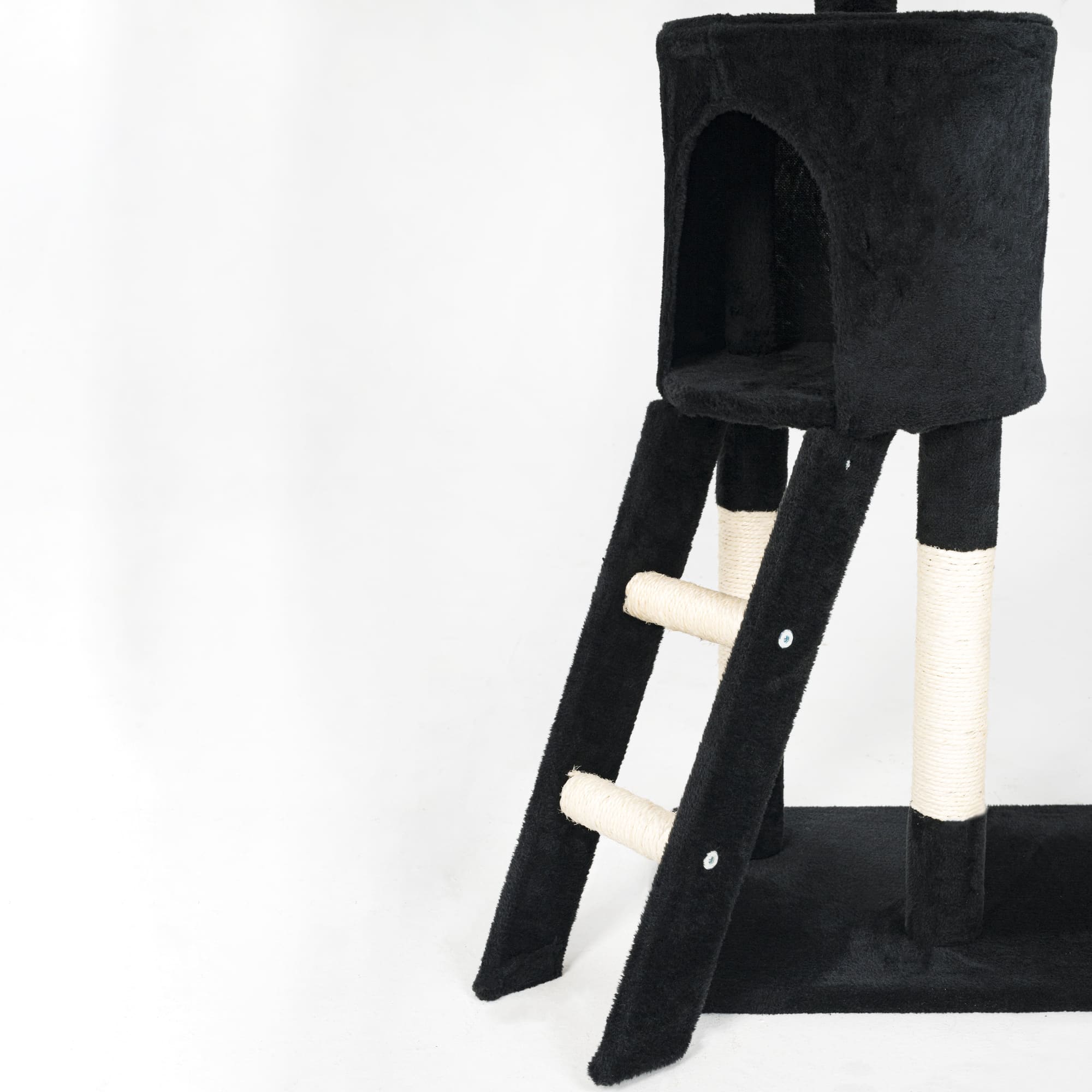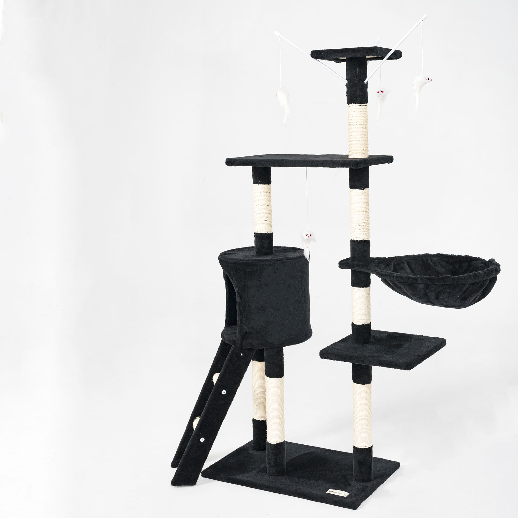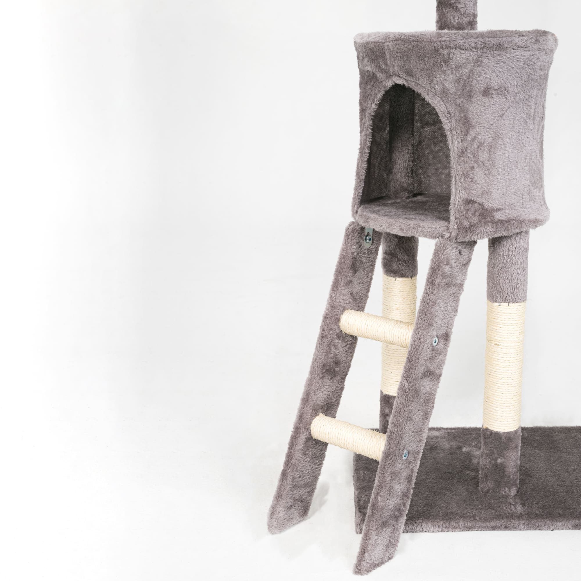 Incluye tres plataformas de distintos tamaños, una acogedora caseta de 29 cm de diámetro y 27 cm de altura, y un cómodo nido de 32 cm de diámetro, proporcionando diversas opciones de descanso y juego. Además, cuenta con una escalera de 18 cm de ancho y tres barras con ratones colgantes de 30 cm, perfectas para estimular el instinto cazador de tu gato.