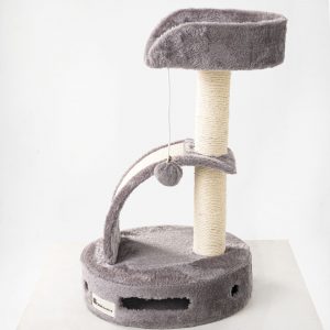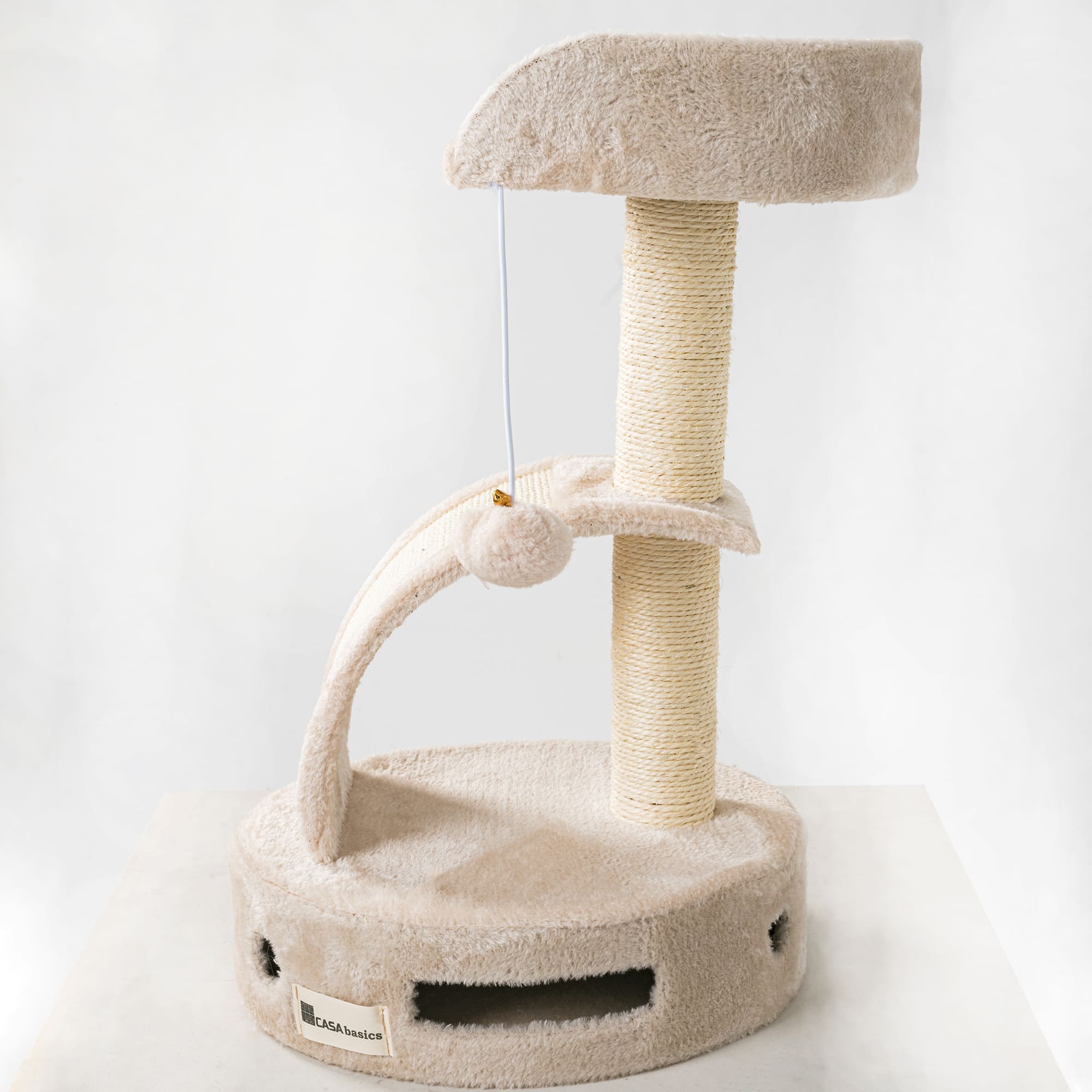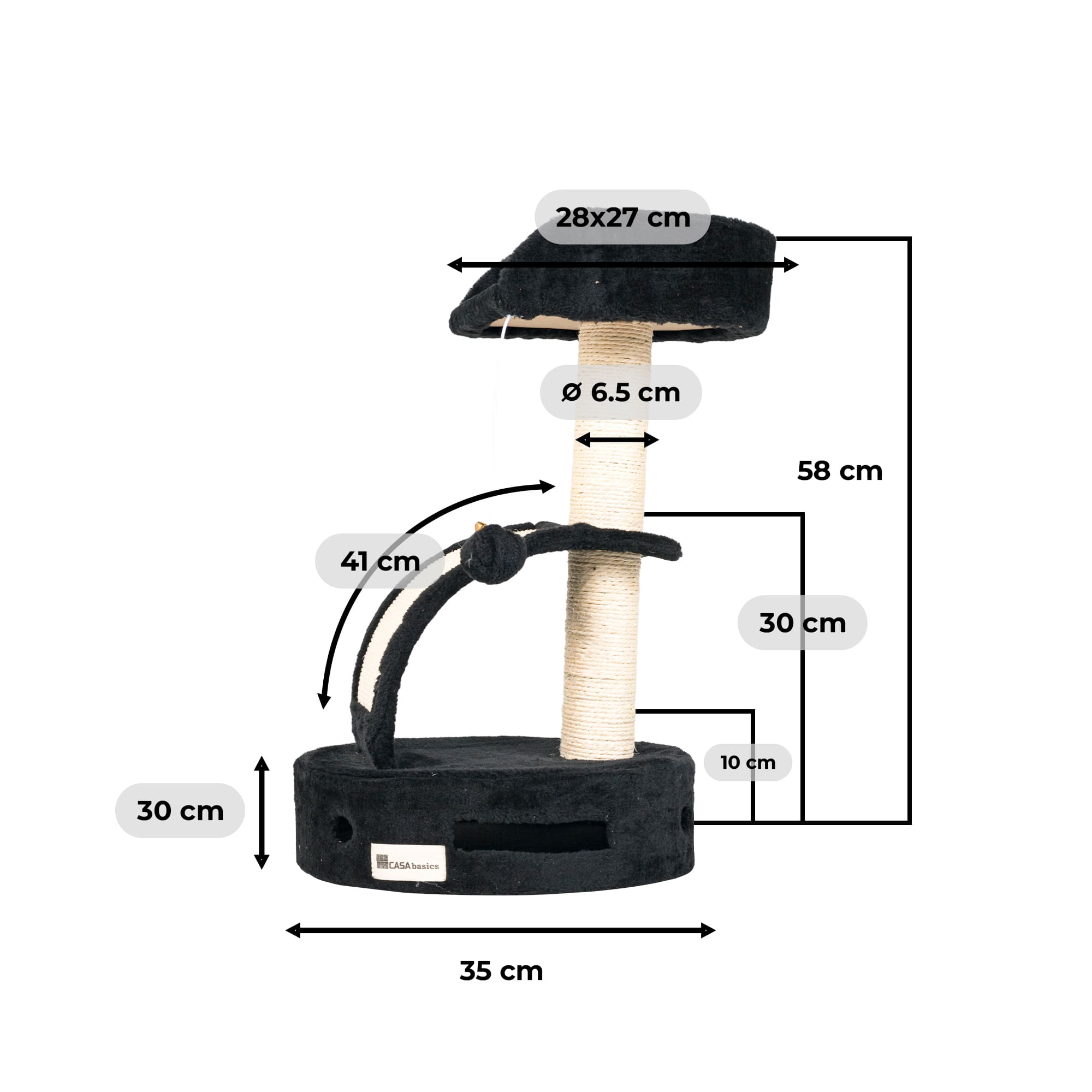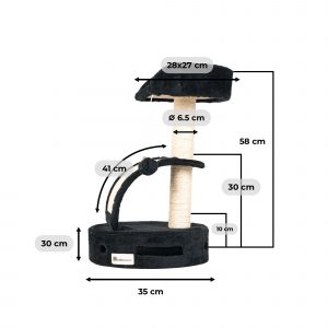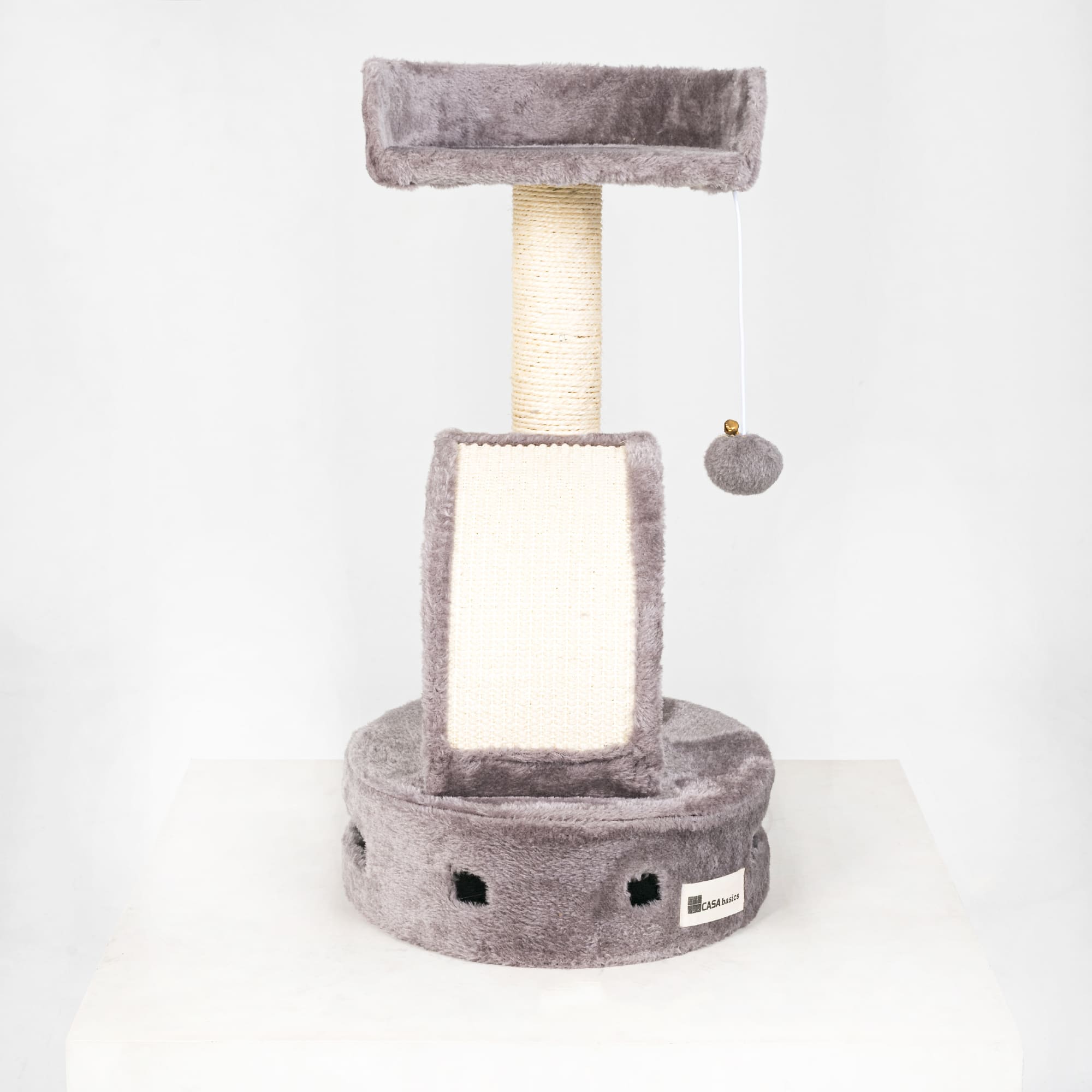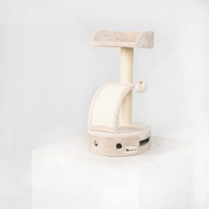 Cuenta con una plataforma superior de 34 cm de diámetro, perfecta para el descanso, y una caseta con entrada de 16.5 cm de diámetro, que brinda un refugio acogedor para la privacidad de tu gato. Sus columnas de 6.5 cm de diámetro están recubiertas con sisal natural, ofreciendo una superficie resistente para afilar sus garras y proteger tus muebles.