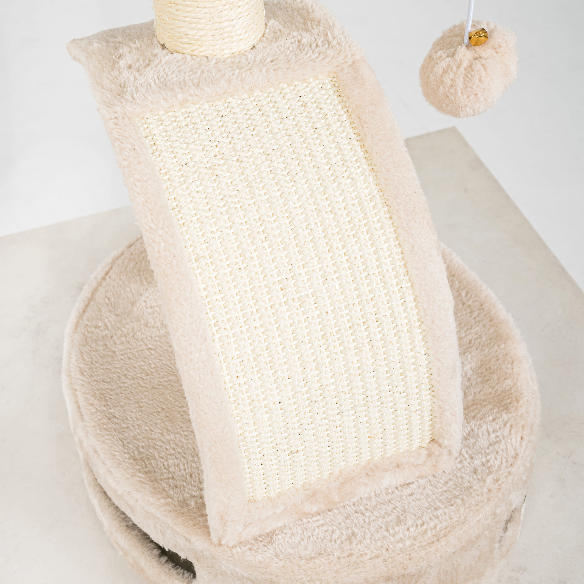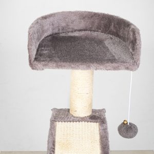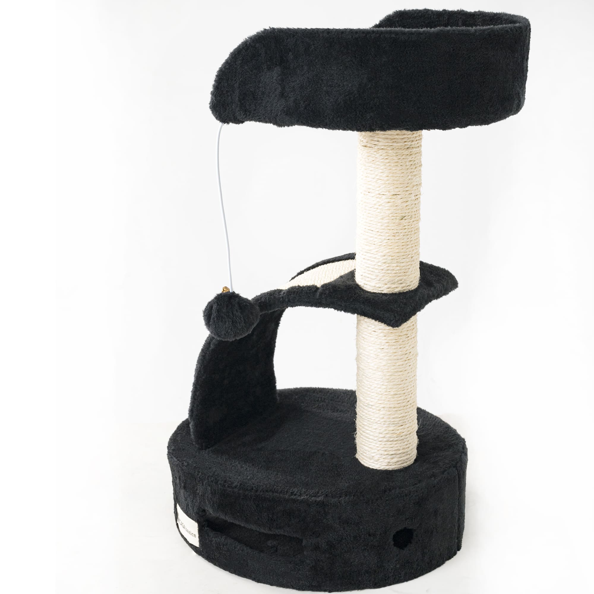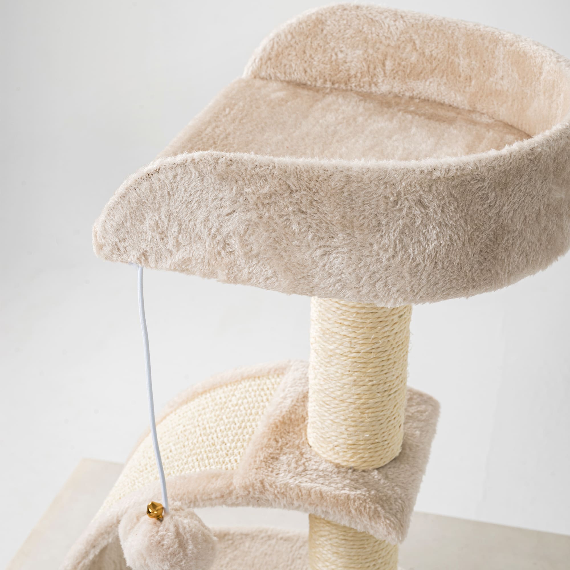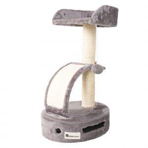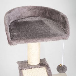 Cuenta con una plataforma superior de 34 cm de diámetro, perfecta para el descanso, y una caseta con entrada de 16.5 cm de diámetro, que brinda un refugio acogedor para la privacidad de tu gato. Sus columnas de 6.5 cm de diámetro están recubiertas con sisal natural, ofreciendo una superficie resistente para afilar sus garras y proteger tus muebles.