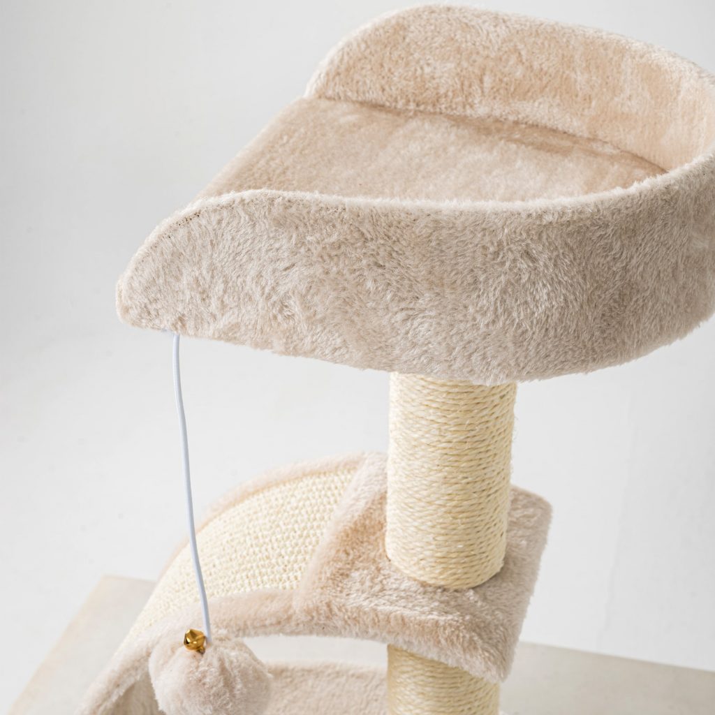 Cuenta con una plataforma superior de 34 cm de diámetro, perfecta para el descanso, y una caseta con entrada de 16.5 cm de diámetro, que brinda un refugio acogedor para la privacidad de tu gato. Sus columnas de 6.5 cm de diámetro están recubiertas con sisal natural, ofreciendo una superficie resistente para afilar sus garras y proteger tus muebles.